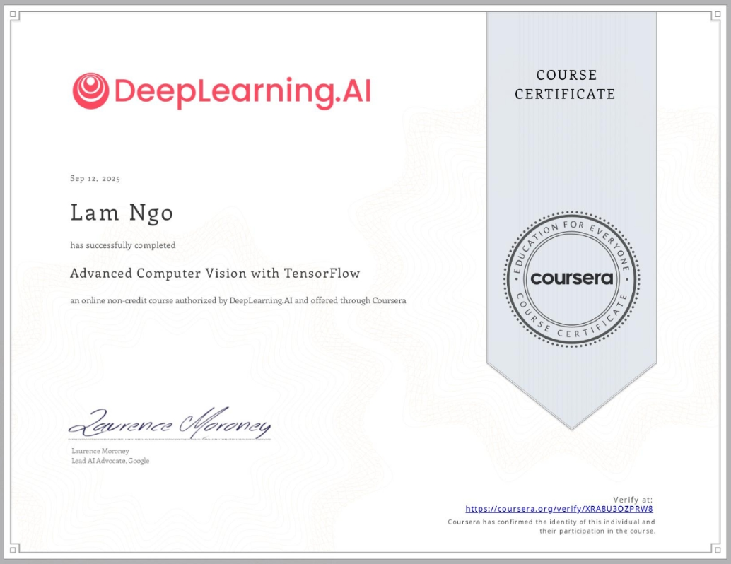 These are the projects from my self-directed learning. Most of them are from the two DeepLearning.AI courses by Andrew Ng: Advanced Computer Vision and Deep Generative Modelling. Each course consists of 4 modules, with one project per module. The project details for relevant topics could be found below. The topics and models covered in each module include: